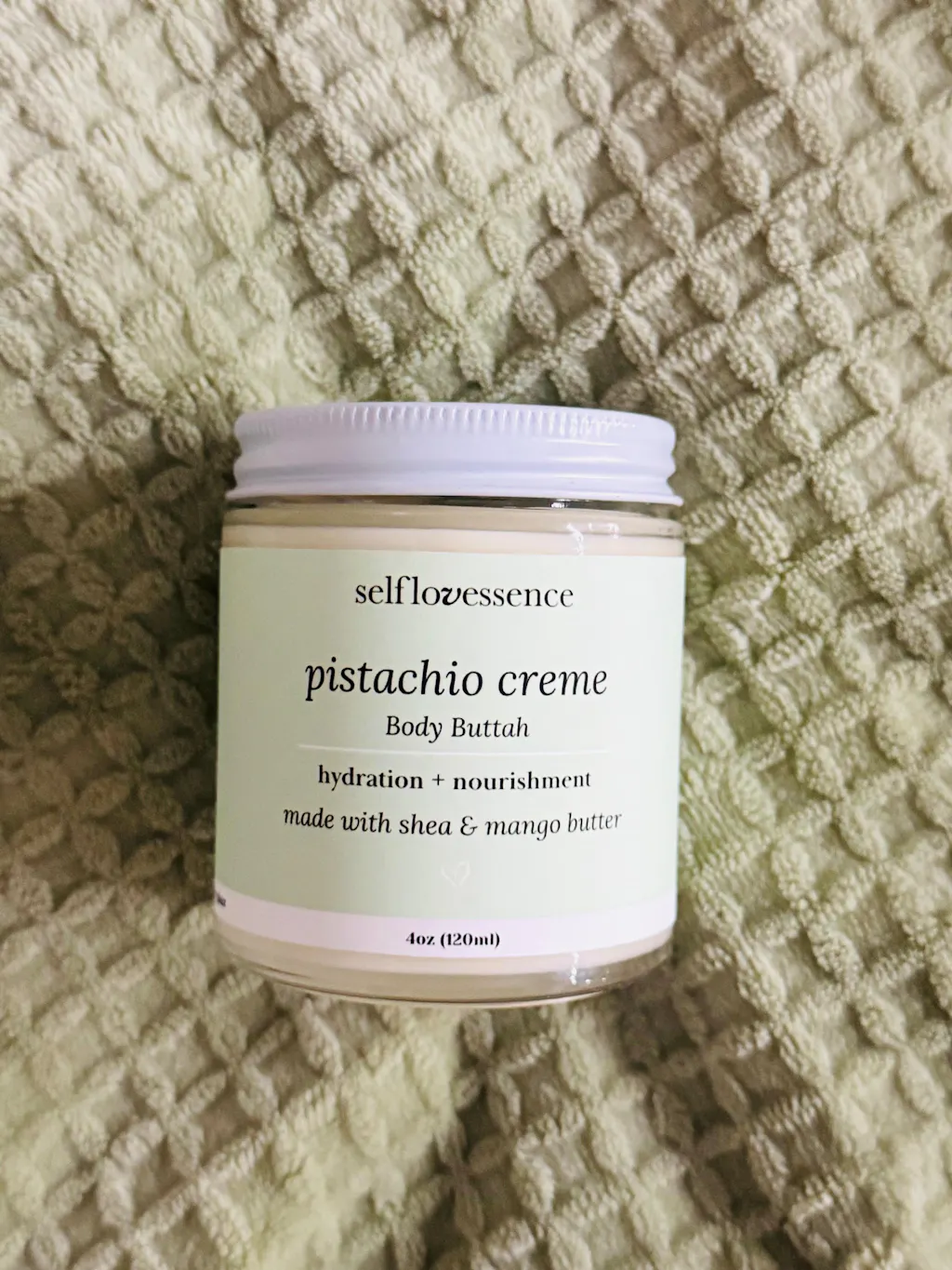 Formulated with plant-based butters and nourishing oils, Pistachio Crème delivers deep, long-lasting moisture while helping soften rough patches, improve uneven tone, and restore your natural glow. The lightweight, non-greasy texture gives your skin a smooth, supple finish that lasts all day.